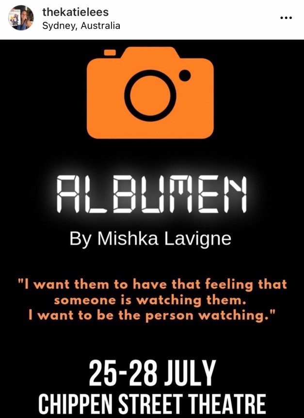 “More new projects to announce! Albumen. Chippen Street Theatre for the @nointermissionfest presented by @theatretravels #theatretravelssyd #indietheatre #sydney #actor #nointermission fest ” – Katie Lees, July 9, 2019